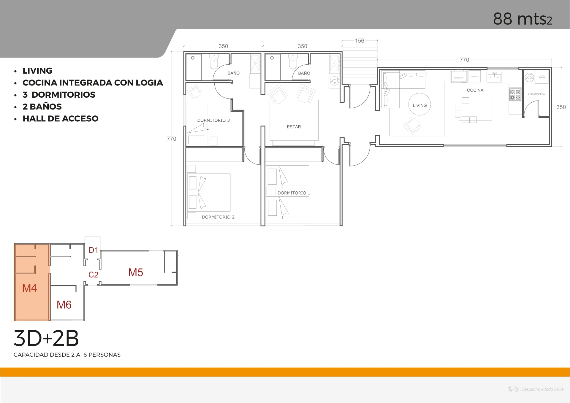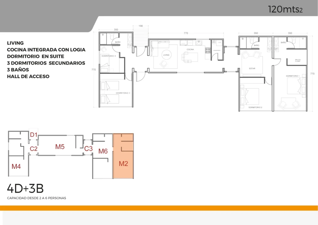 - El modelo de 60m² dormitorio con una sala de estar, modelos de 88 m² dos dormitorios con uno en suite y para el modelo de 120 m² cuatro dormitorios y uno de ellos en suite.
