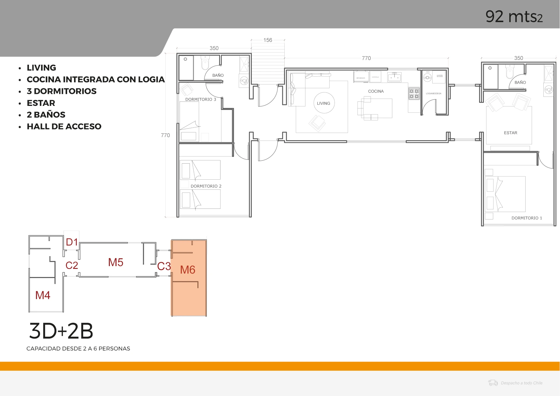 - Piso vinílico SPC en dormitorios, cocina, baño y pasillos
