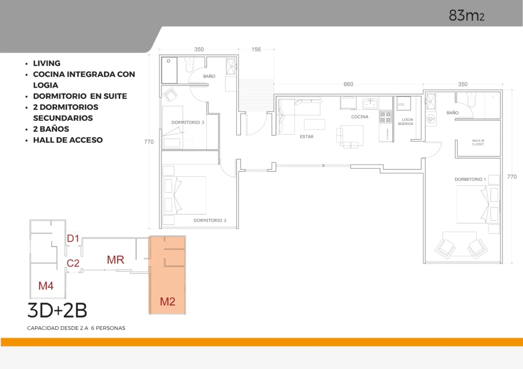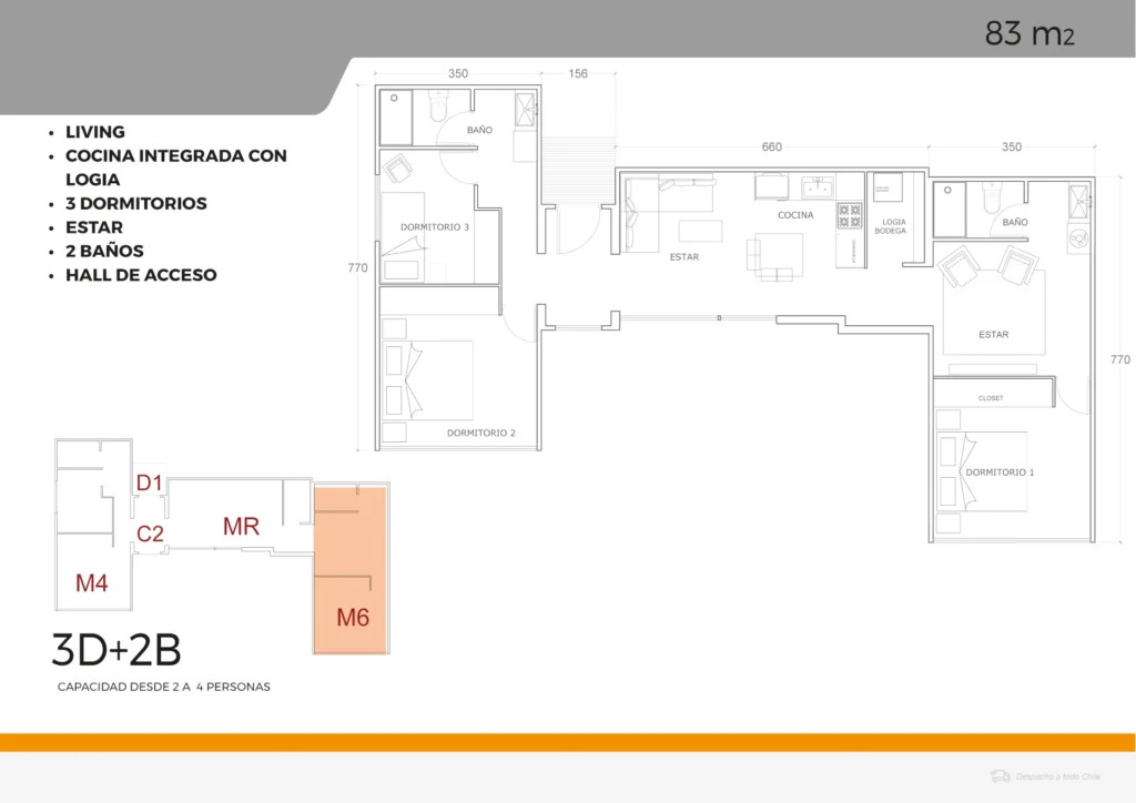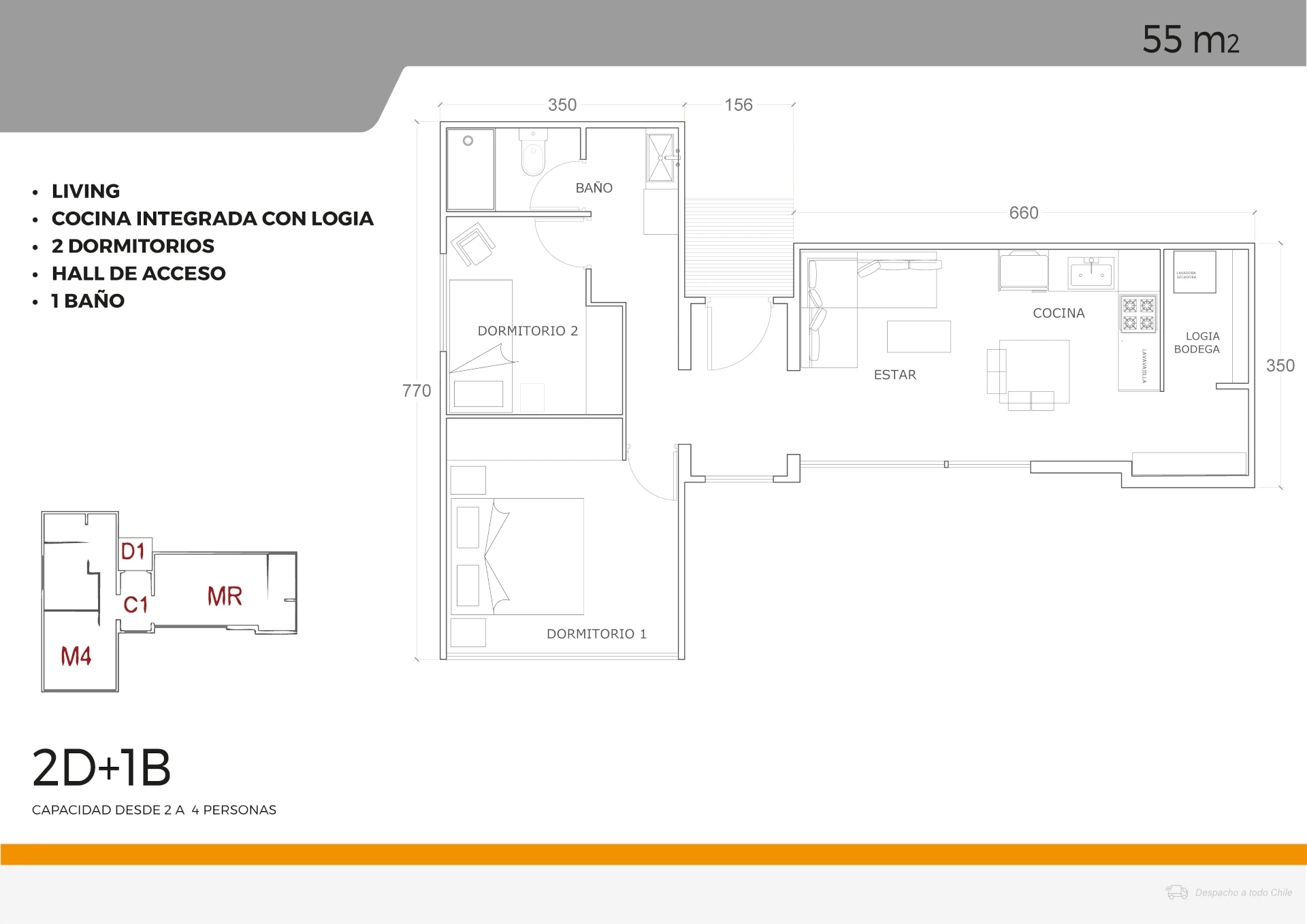 Diseñada con dos módulos principales y un módulo conector. Esto permite tener cocina – estar en un solo espacio y un módulo que nos entrega la privacidad para el dormitorio. Además, considera un hall de acceso que nos invita a disfrutar de este diseño.